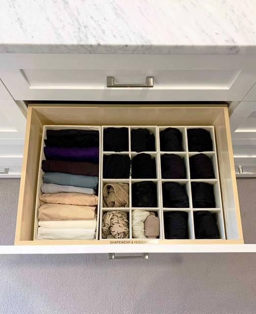 There are many affordable options for drawer organizers. Be creative and look beyond closet accessories. For example, kitchen organizers, photo storage boxes and shoeboxes may be suitable options. When planning the organization of your drawers, determine what you’ll be storing in each one and then have their measurements handy before you shop.